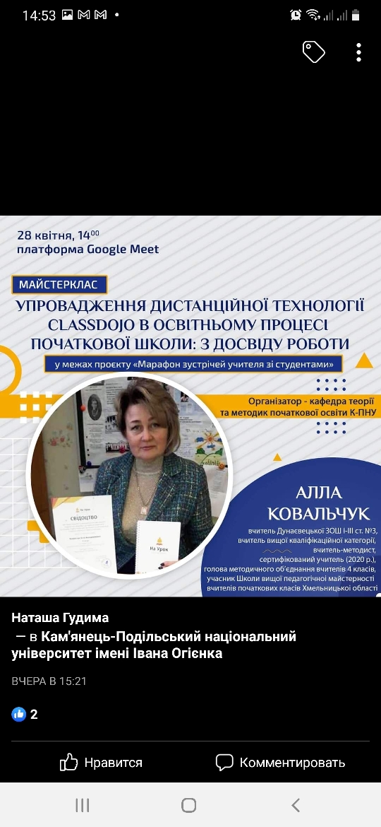 Майстер-клас «Упровадження дистанційної технології CLASSDOJO в освітньому процесі початкової школи: з досвіду роботи»