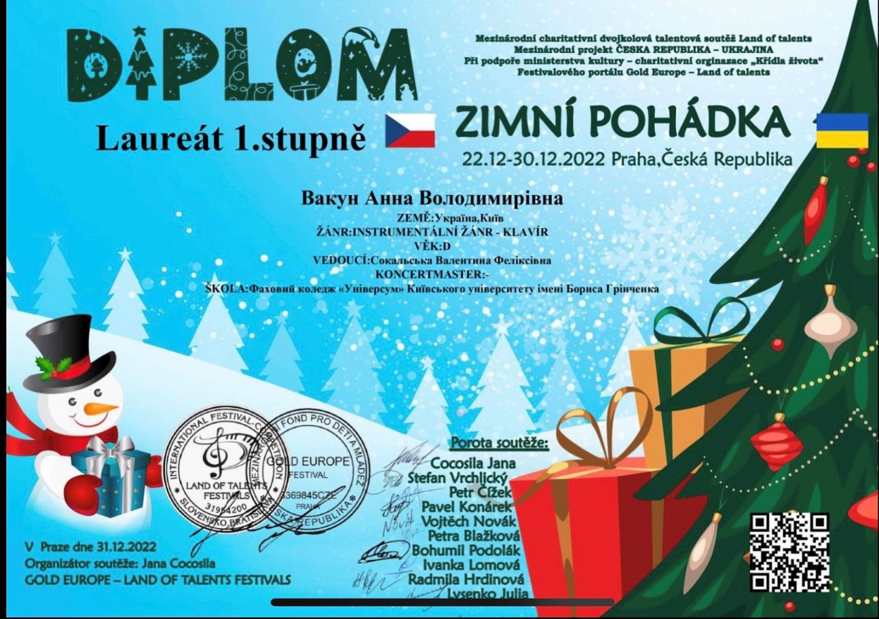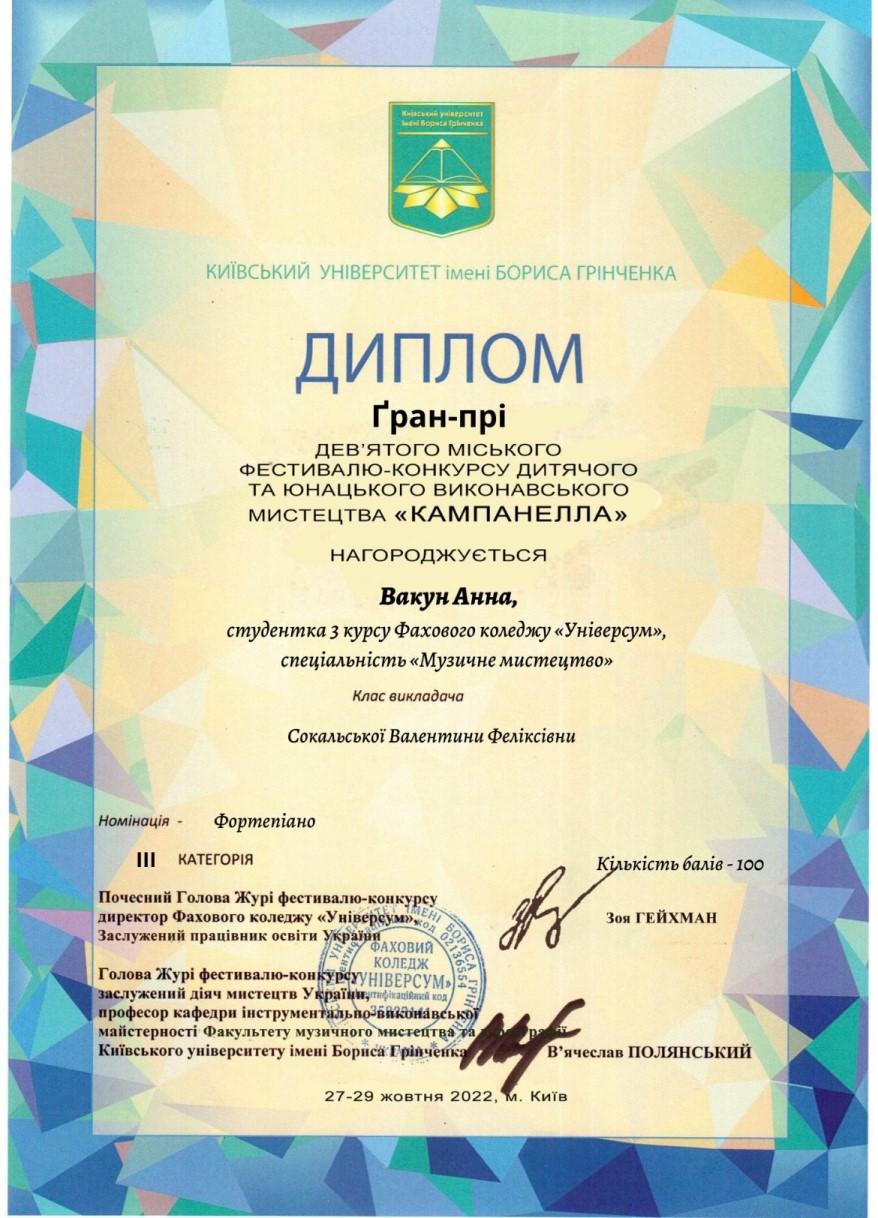 Анна Вакун – переможниця міського фестивалю-конкурсу «Кампанелла» та трьох Міжнародних мистецьких конкурсів