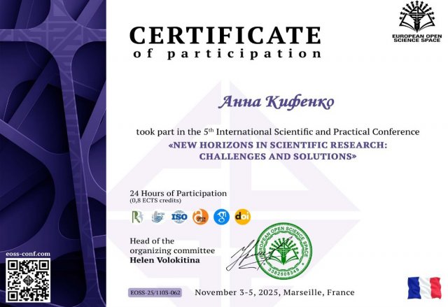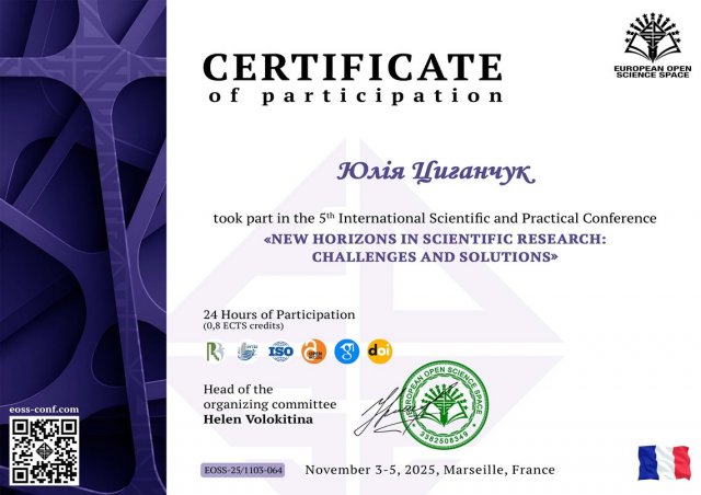 Участь у Міжнародній науково-практичній конференції "New Horizons in Scientific Research: Challenges and Solutions” (Марсель, Франція)
