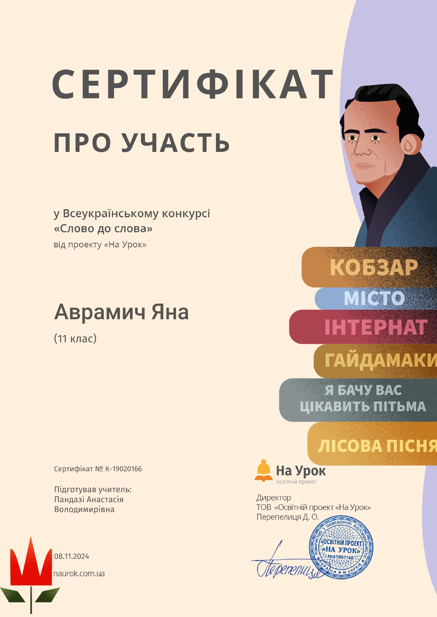 Студенти групи ОВфмб-1-23-3,5д під керівництвом куратора Пандазі А.В. долучилися до Всеукраїнського інтернет-конкурсу «Слово до слова» на платформі «На урок», присвяченого Дню української писемності та мови, який проходив з 15 жовтня по 12 листопада 2024 року..