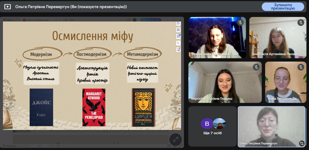 15 листопада 2025 року відбулася онлайн зустріч на тему “Інтерпретація античних сюжетів у сучасній культурі”. Учасники розглянули трансформацію образу Одіссея та інших гомерівських героїв у різних літературних напрямках ХХ-ХХІ ст. (на прикладах творів “Улісс” Джеймса Джойса, “Персі Джексон і Море чудовиськ” Ріка Ріордана, “Пенелопіада” Маргарет Етвуд, “Цирцея” Медлін Міллер). Наприкінці заняття було узагальнено досвід переосмислення античних сюжетів у світовій літературі.