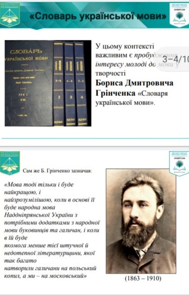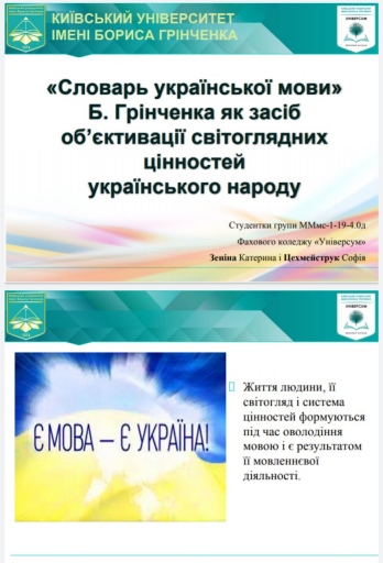 Студентки спеціальності «Музичне мистецтво» Фахового коледжу «Універсум» Зеніна Катерина та Цехмейструк Софія виступили з доповіддю «Словарь української мови» Бориса Грінченка як засіб об’єктивації світоглядних цінностей українського народу»