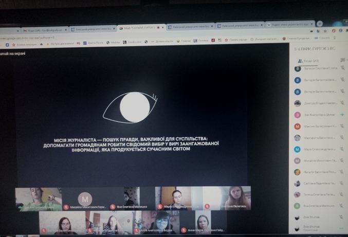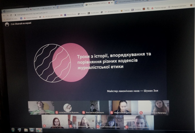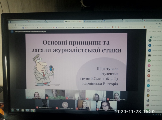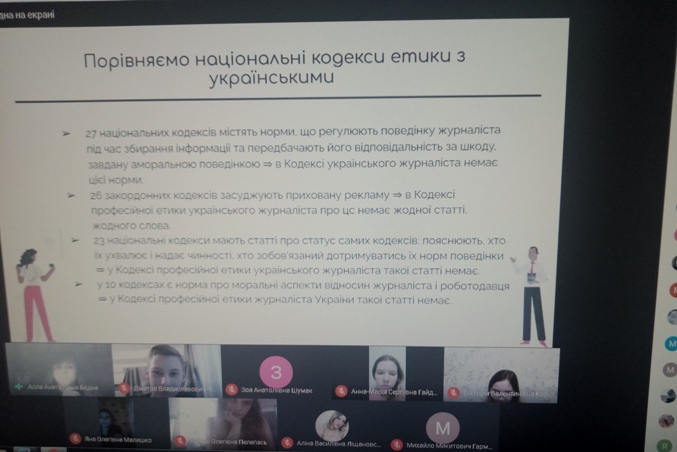 23 листопада 2020 року відбувся онлайн-семінар гуртка журналістики «Дискурс» на тему: «Професійна етика українського журналіста». Разом зі студентами обговорили історію впорядкування та порівняння кодексів етики українських журналістів, етичний кодекс українських журналістів США та Канади; проаналізували основні принципи та засади журналістської етики, розглянули та проаналізували культуру звертань у професійній діяльності журналіста; професійну мораль, її особливості та функції.