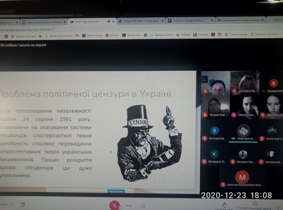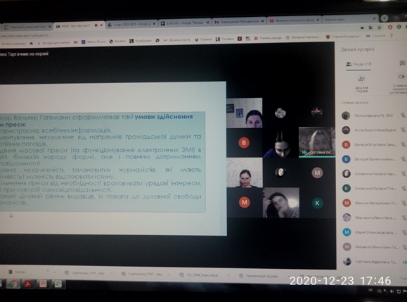23 грудня 2020 року відбулася онлайн-бесіда «Свобода слова в журналістиці». Разом зі студентами проаналізували статистику свободи слова в Україні, географію порушень свободи слова в Україні, обговорили матеріали друкованих та інтернетних ЗМК щодо переслідування українських журналістів за висвітлені ними теми; проаналізували поняття «цензура» як елемент інформаційної війни, цензуру в медіапросторі.