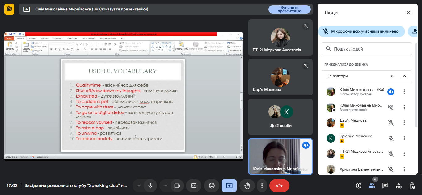 12 березня 2025 року у рамках декади циклової комісії іноземних мов було проведено засідання розмовного клубу "Speaking club" на тему "All about self-care".