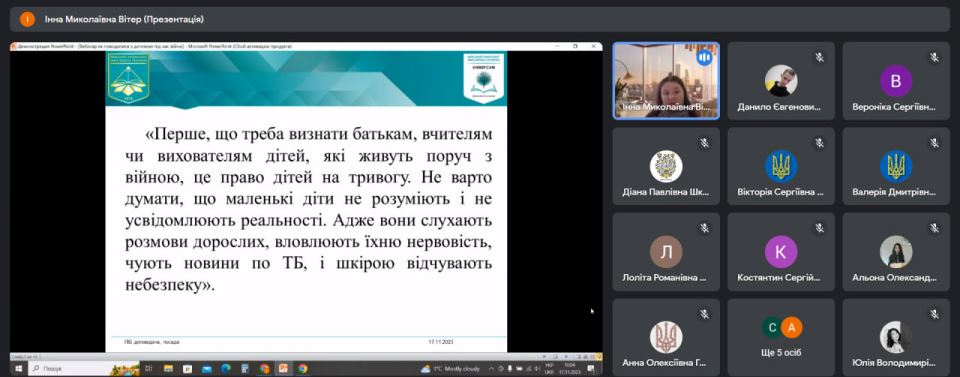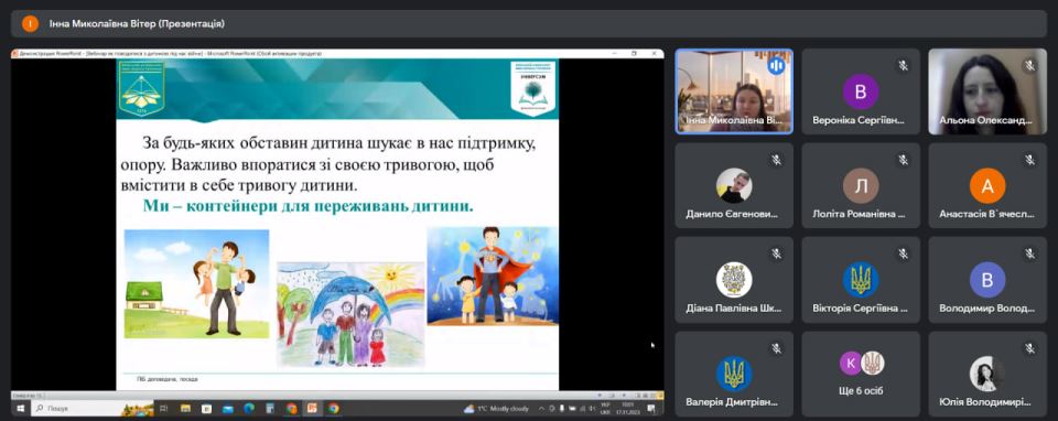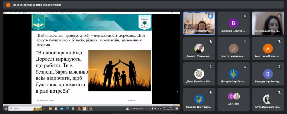 17 листопада 2023 року в рамках соціального проєкту "Війна не відміняє дитинство" практичний психолог Коледжу Вітер І.М. провела відкритий вебінар "Як говорити та поводитися з дітьми під час війни?", де підняла важливі питання адаптації дітей молодшого шкільного віку до військових дій в Україні та підримки дітей, які постійно знаходяться у стані тривоги.