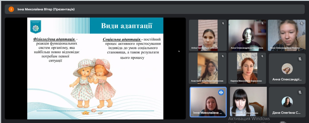26 березня 2024 року у Фаховому коледжі "Універсум" в рамках соціального проєкту "Війна не відміняє дитинство" відбувся вебінар "Легка адаптація до садочку", де учасники заходу разом з практичним психологом Інною ВІТЕР проаналізували типи соціалізації дітей дошкільного віку у соціальному середовищі дитячого садочку.