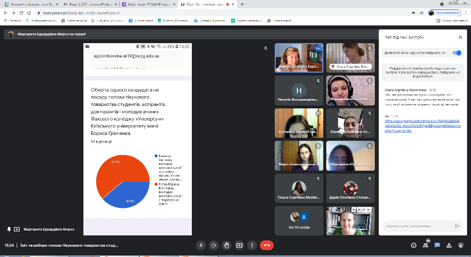 Після звіту відбулися онлайн вибори голови Наукового товариства Фахового коледжу «Універсам» Київського університету імені Бориса Грінченка. Кандидати, Кравець Світлана Геннадіївна, викладач циклової комісії економіко-математичних дисциплін і менеджменту та Рєпка Марина Василівна, викладач циклової комісії з педагогічної освіти, представили свої передвиборчі програми, деталізуючи основні напрями діяльності. За результатами виборів головою Наукового товариства було обрано Рєпку Марину Василівну, викладача циклової комісії з педагогічної освіти.