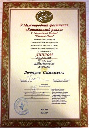 Студентка II курсу спеціальності «Музичне мистецтво» Людмила Світельська взяла участь у Конкурсі юних піаністів Міжнародного фестивалю фортепіанної музики «Каштановий рояль», що 17–21 травня 2017 року відбувався у Києві.