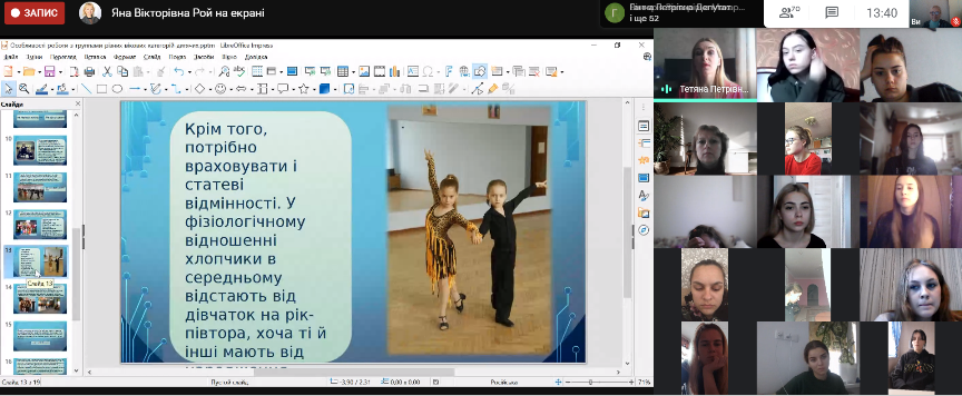 Захід пройшов у теплій, дружній, творчій атмосфері. Студенти-хореографи мали можливість ознайомитися з особливостями роботи у групах різних вікових категорій на прикладі роботи успішного колективу ТОВ Клуб спортивного бального танцю “ТенДенс”, отримати цінні знання, практичні поради від тренера-викладача з багаторічним досвідом роботи Тетяни Петрівни Євтушенко.