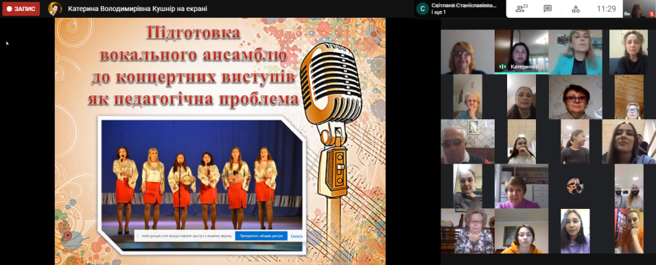 Катерина Кушнір на високому науковому рівні продемонструвала фрагменти практичних занять з вокальним ансамблем, поділилася методикою репетиційної роботи, дала поради щодо подолання стресового емоційного стану учасників вокального-хорового ансамблю, розкрила методи роботи над хоровою партитурою.