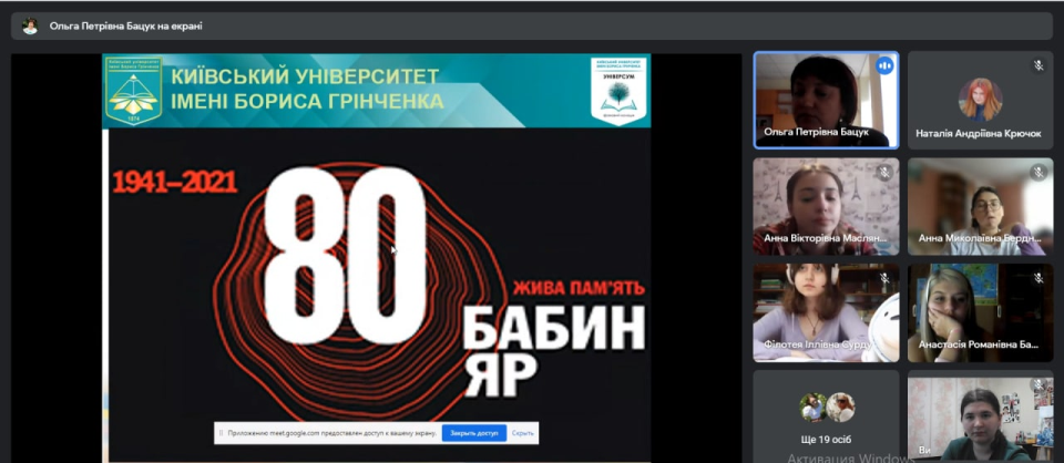 Студенти, переглянувши фото та відеодокументи, ознайомились з історією та сутністю Голокосту в Україні через призму трагедії Бабиного Яру, де 80 років тому відбулись масові розстріли євреїв та представників інших національностей та з тим, що Голокост завжди буде слугувати всьому людству пересторогою про небезпеки, які приховують у собі ненависть, фанатизм, расизм, упередження.