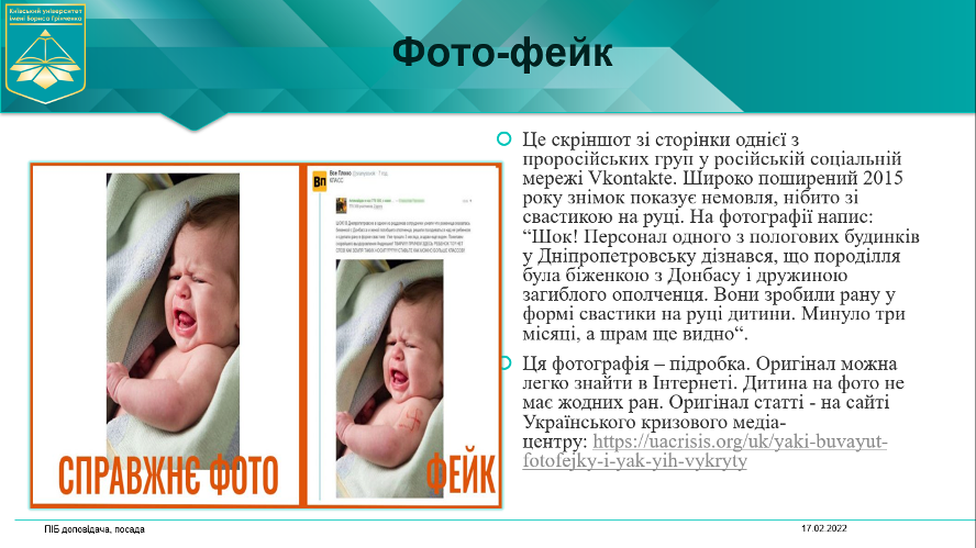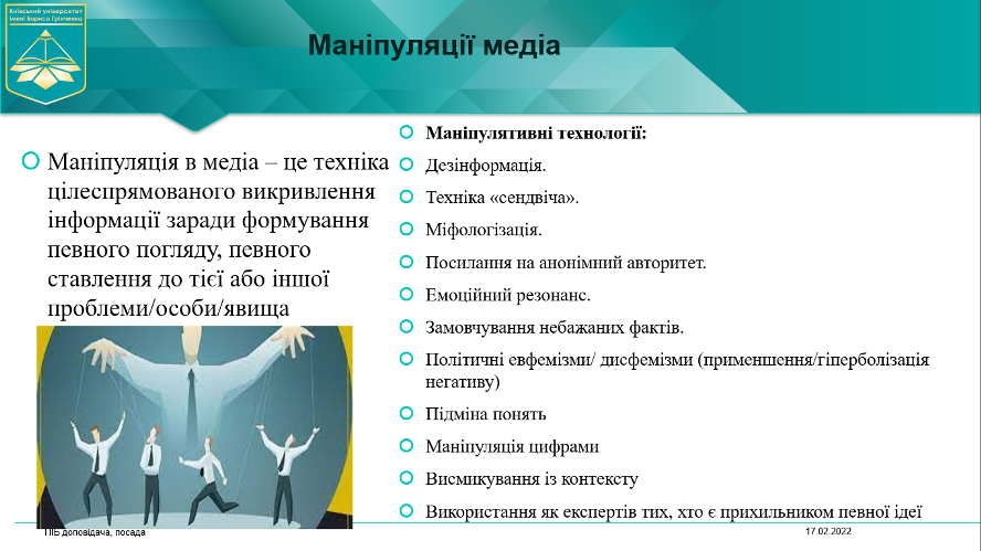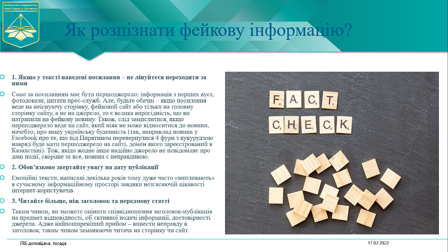 Студенти будуть ознайомлені з основними маніпулятивними технологіями, які можуть використовувати мас-медіа, з поняттям "фейк" та отримають практичні поради, як розпізнати фейкову інформацію, виявити фотофейк та з тим, які сайти в Україні перевіряють фейки.