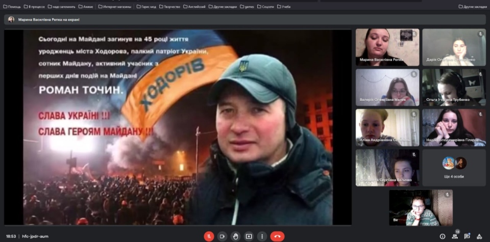 День Героїв Небесної Сотні відзначають щорічно 20 лютого згідно з Указом Президента від 11 лютого 2015 року № 69/2015 "Про вшанування подвигу учасників Революції Гідності та увічнення пам'яті Героїв Небесної Сотні". Ми зі студентами 3 курсу спеціальності «Соціальна робота» 18 лютого 2022 року доєдналися до відзначення цієї події. Метою заходу було поповнити і узагальнити знання студентів, щодо подій лютого 2014 року, сприяти розвитку емпатії та вміння співпереживати; сприяти створенню емоційної і мислиннєвої ситуації, що вплине на розвиток почуття вдячності і поваги до Героїв Небесної Сотні.