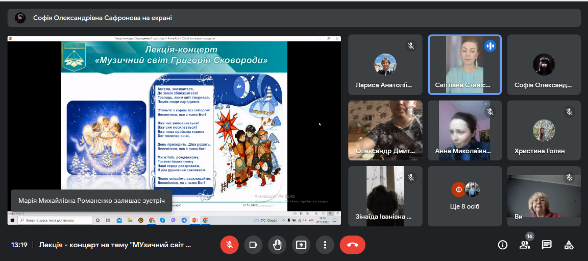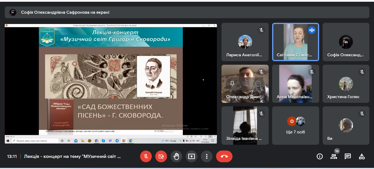 Під час лекції доповідач Кравченко С.С. приділила особливу увагу збірці «Сад божественних пісень» – зразку поетичної майстерності у стилі бароко. Слухачі прослухали музичні твори з цієї збірки - "Всякому місту звичай і права", "Гей ти, пташко жовтобока", "Ангели знижайтеся", "Розвіялись хмари", "Стоїть явір над водою", "Час життя дорогоцінний".