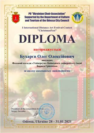 28.01-31.01.2021р. відбувся І Міжнародний фестиваль-конкурс мистецтв "СhristmasFest" (дистанційно), який проводила Українська Хорова Асоціація.