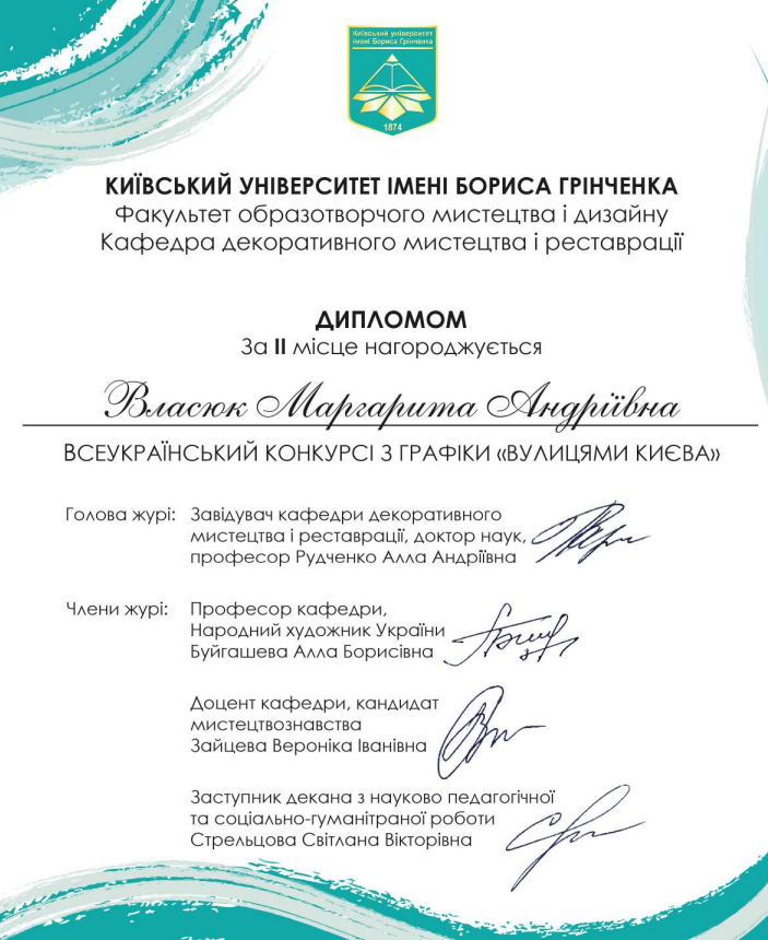 Вітаємо Волянську Варвару, Власюк Маргариту та Шпак Марію, студенток 3 та 4 курсу спеціальності Образотворче мистецтво за друге місце у Всеукраїнському конкурсі з графіки "Вулицями Києва" (організатор кафедра декоративного мистецтва і реставрації факультету образотворчого мистецтва і дизайну Київського університету імені Бориса Грінченка). Бажаємо творчих успіхів у нових мистецьких проєктах!