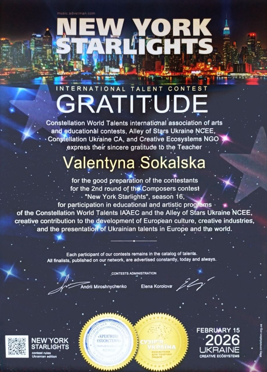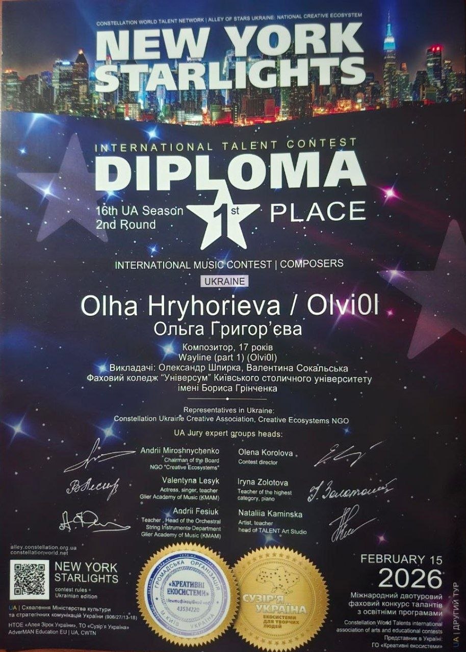 Вітаємо студентку 2 курсу спеціальності «Музичне мистецтво» Григор’єву Ольгу з перемогою: диплом І ступеня в Міжнародному двотуровому конкурсі композиторів «New York Starlights». Також переможниця посіла почесне місце в «Алеї зірок України».
