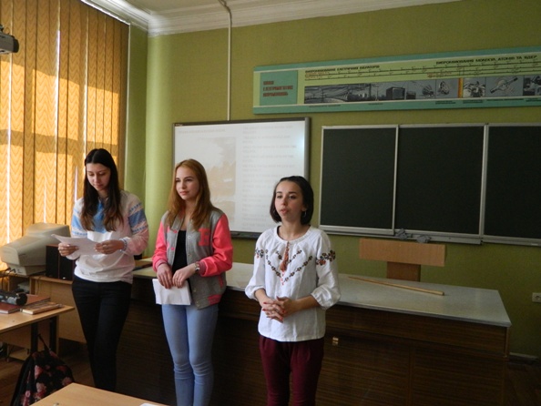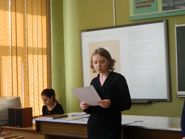 Метою заходу було ознайомити студентів із впливом поезії Т.Шевченка на закордонного читача, продемонструвати всесвітньо відомі переклади творів англійською мовою. Майстерна декламація студентками віршів “I was thirteen”, “Fate”, “It does not touch me, not a whit”, “It makes no difference to me” та ін. дала можливість відчути мелодійність поезії та усвідомити її глибину. Прочитання декількох перекладів “My testament” допомогло зрозуміти, що різними мовними засобами можливо передати одну думку, витримавши авторський стиль. Про життя митця розповіли не лише ведучі, але й юні актори від імені Шевченка-підлітка, студента та зрілого поета. Дуже зворушливим було виконання покладених на власні мелодії віршів “Near the hut the cherries are in bloom ” та “The mighty Dnieper roars and bellows” талановитими першокурсницями Дариною Волянською та Оленою Карачій.