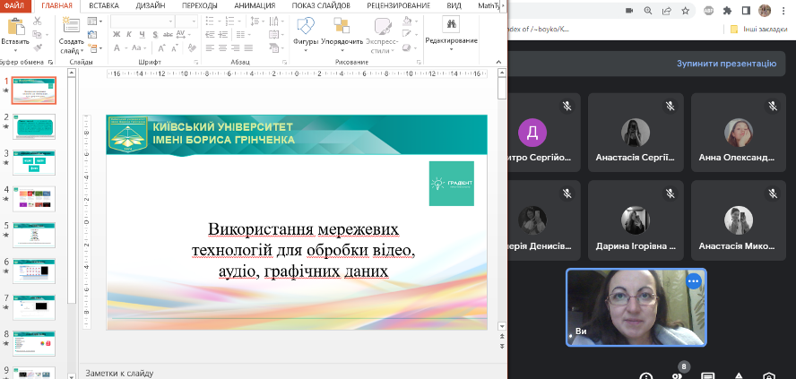 13 квітня 2022 року відбулося чергове засідання наукового математичного гуртка Градієнт. Тема зустрічі: "Використання мережевих технологій для обробки відео, аудіо та графічних даних".