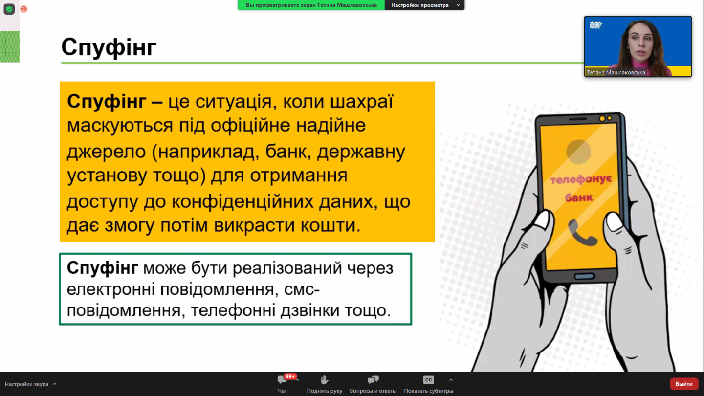 24 березня студенти та викладачі ЦК економіко-математичних дисциплін і менеджменту взяли участь у вебінарі «10 найпоширеніших схем платіжного шахрайства у воєнний час» за авторством головної експертки управління зв’язків з громадськістю та фінансової обізнаності Національного банку України Тетяни Машлаковської.