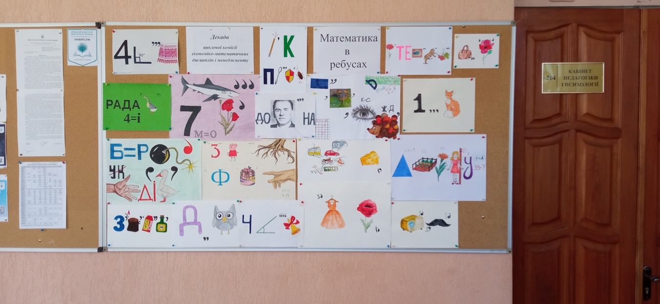 У рамках декади комісії «Економіко-математичних дисциплін і менеджменту» серед студентів 1 курсу спеціальностей «Початкова освіта», «Образотворче мистетство» та «Дизайн» була проведена виставка творчих робіт студентів: «Математика в ребусах», мета якої популяризувати вивчення математики засобами ігрової діяльності, розширити словник математичних термінів, спонукати студентів до розвитку уяви, логічного мислення та формування навичок творчого мислення, а також уміння інтегрувати знання з мови, музики та образотворчого мистецтва.