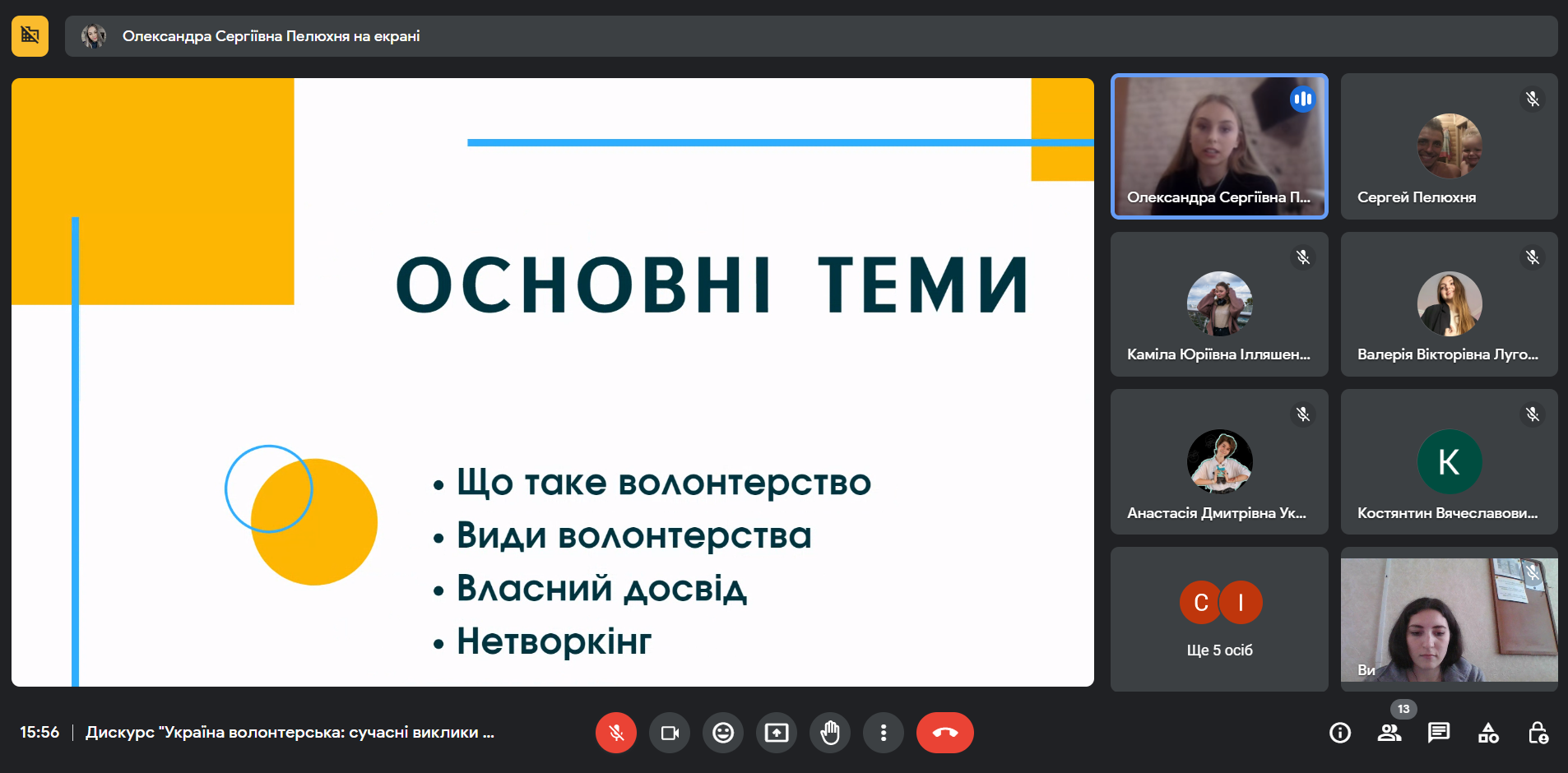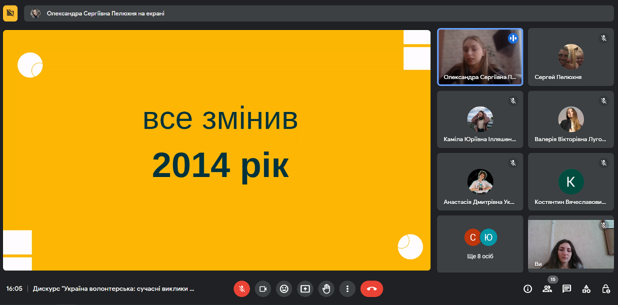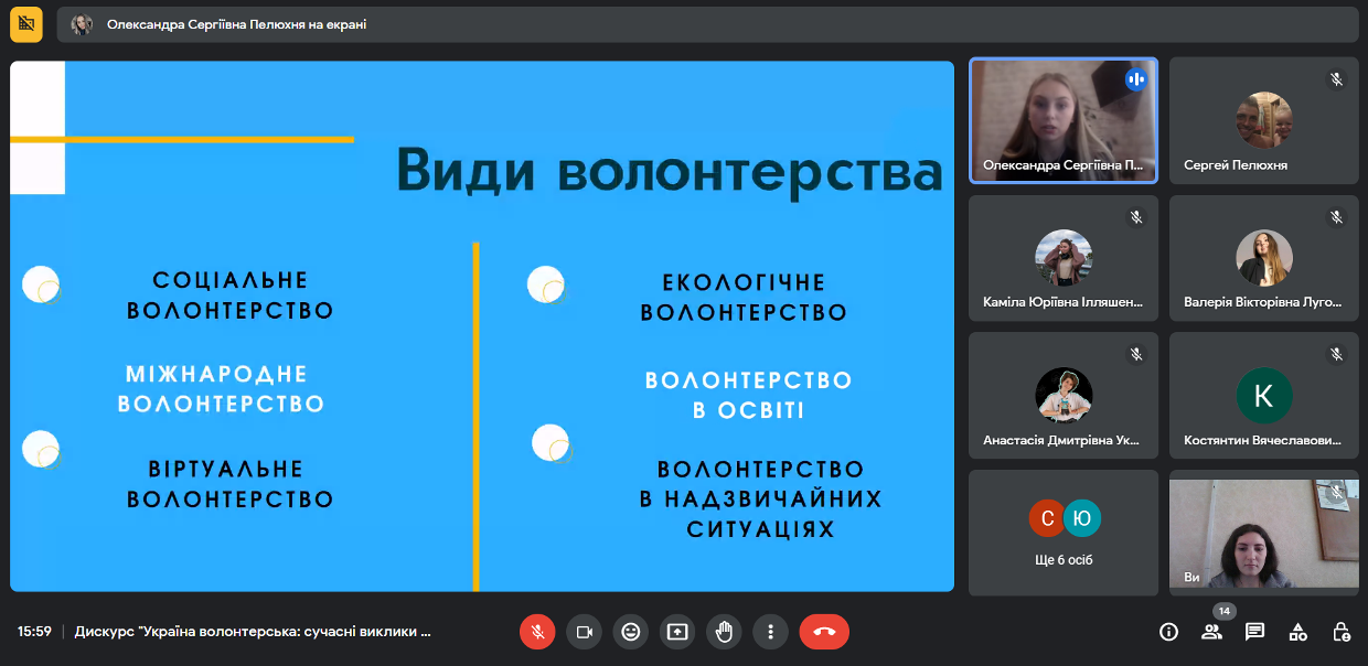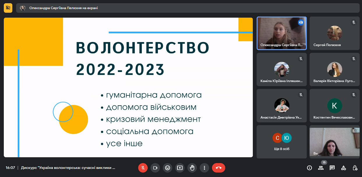 13 квітня 2023 року в рамках «Тижня Коледжу-2023» у Фаховому коледжі «Універсум» Київського університету імені Бориса Грінченка було проведено онлайн зустріч зі студенткою 4 курсу спеціальності «Менеджмент», волонтеркою Олександрою Пелюхнею.