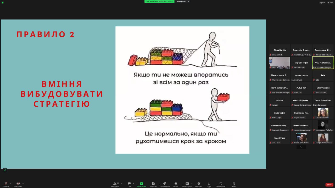 Під час зустрічі Олена Іщенко розповіла про діяльність Українського центру культурних досліджень, про важливі аспекти, на які треба звернути увагу у проєктному менеджменті. Зокрема, пані Олена підкреслила, що для успішної кар'єри в державній установі важливо мати не лише теоретичні знання, але й практичний досвід.