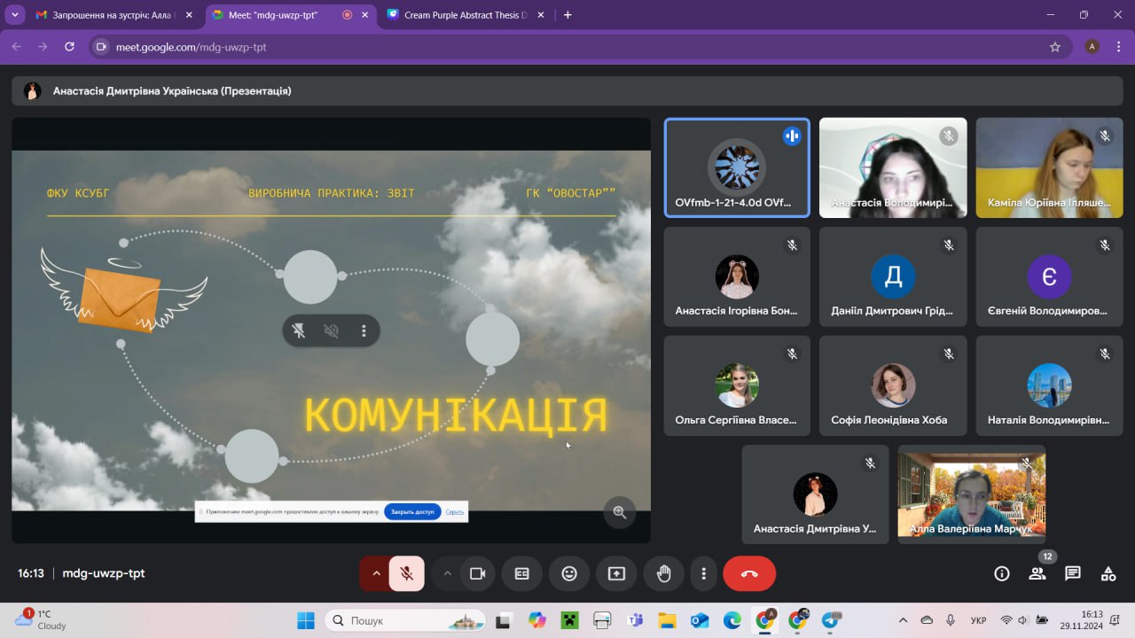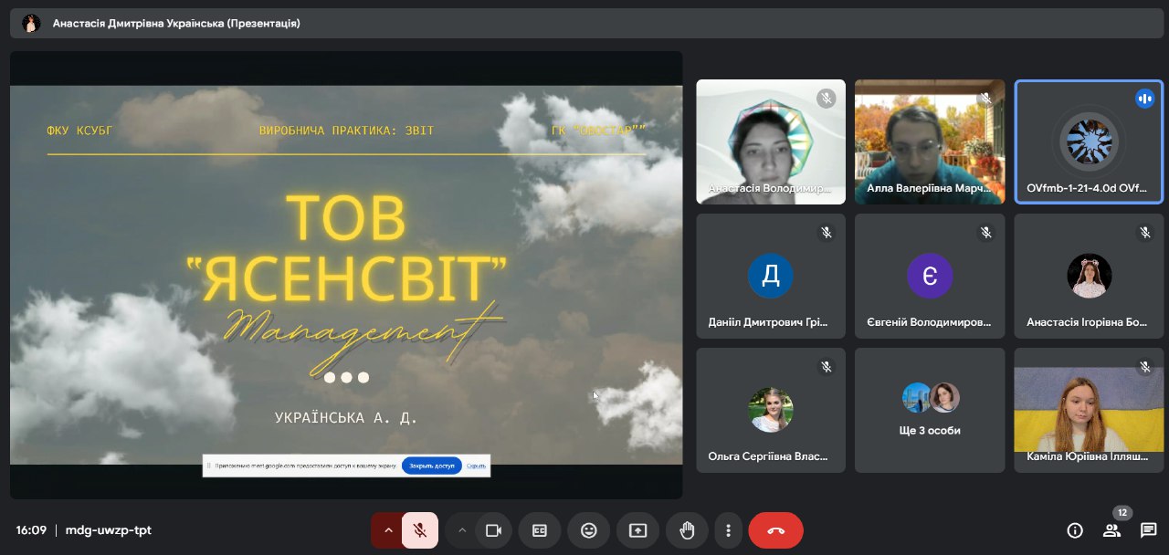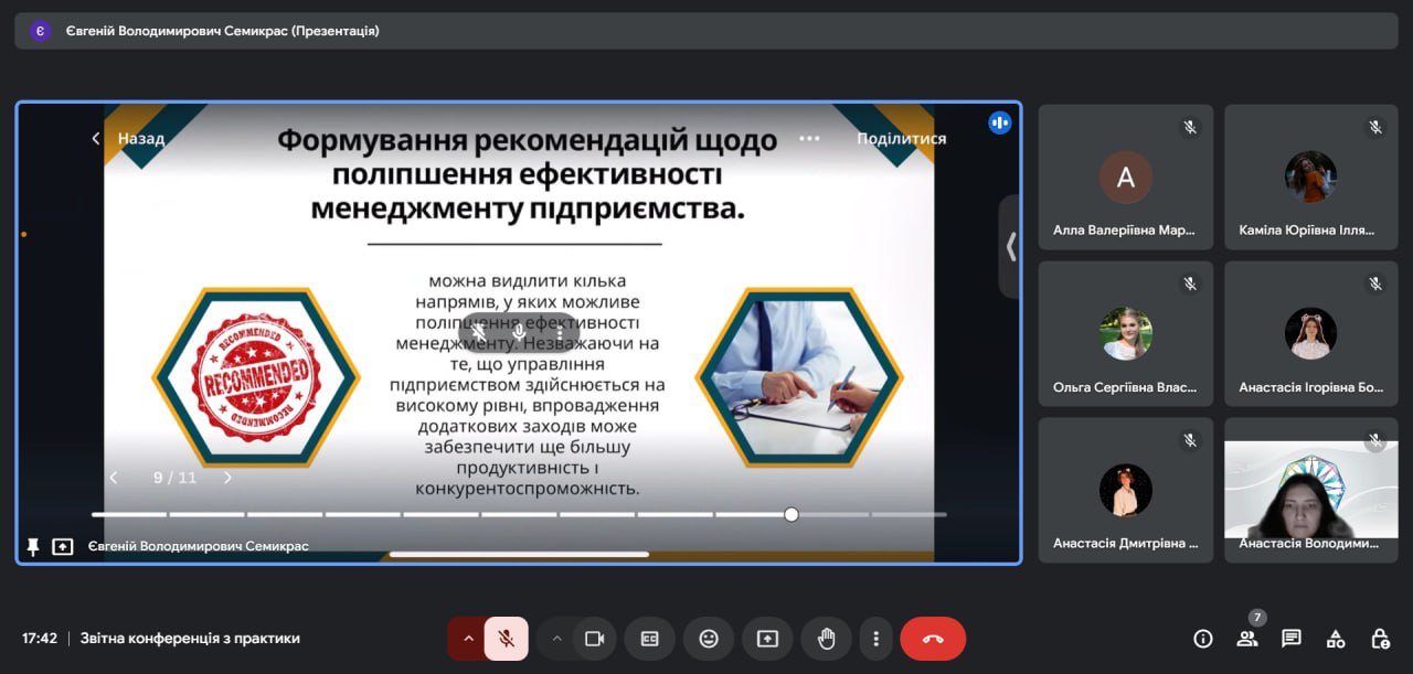 Студенти 4 курсу спеціальності «Менеджмент» з 18.11.2024 по 29.11.2024 проходили виробничу (технологічну) практику з менеджменту. Здобувачі освіти аналізували роботу підприємств за такими критеріями: корпоративна культура, процес планування, організація та проведення ділових нарад тощо. У результаті вони сформували пропозиції щодо поліпшення ефективності менеджменту підприємств та презентували звітні матеріали на захисті практики.