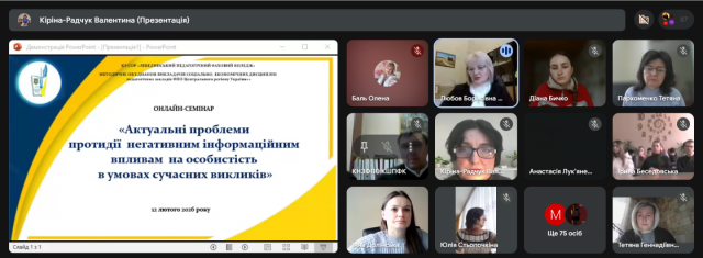 12.02.2026 року відбувся онлайн-семінар «Актуальні проблеми протидії негативним інформаційним впливам на особистість в умовах сучасних викликів» в межах засідань регіональних методичних об'єднань викладачів соціально-економічних, філологічних дисциплін та керівників фізичного виховання на базі КЗ СОР «Лебединський педагогічний фаховий коледж», в якому взяла участь викладач економіко-математичних дисциплін і менеджменту Фахового коледжу «Універсум» Станжур Т.Г.