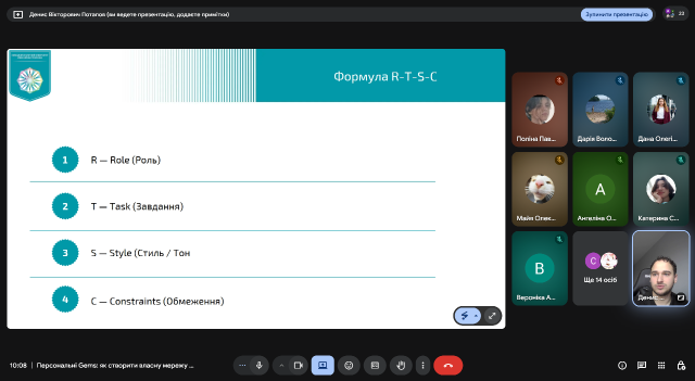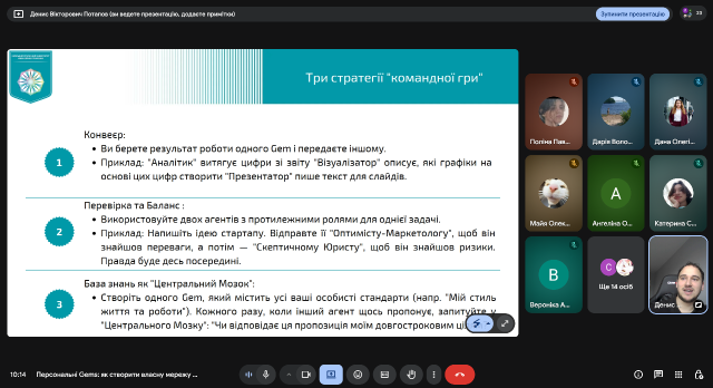 Метою заходу було ознайомлення студентів та викладачів із інноваційними інструментами штучного інтелекту для персоналізації освітнього процесу та формування практичних навичок проектування кастомних ШІ-агентів. Під час майстер-класу. було апробовано такі методи, як: методологія R-T-S-C, що дозволила учасникам створювати системні інструкції для Gems за алгоритмом «Роль–Завдання–Стиль– Обмеження»; метод мультиагентних ланцюжків, який допоміг навчитися будувати комплексні робочі процеси між декількома спеціалізованими агентами.