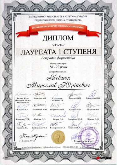 БЕВЗЮК МИРОСЛАВ (ІV курс) – ДИПЛОМ Лауреата I ступеня, номінація «Естрадне фортепіано» (клас викладача Романенко А.Р.);