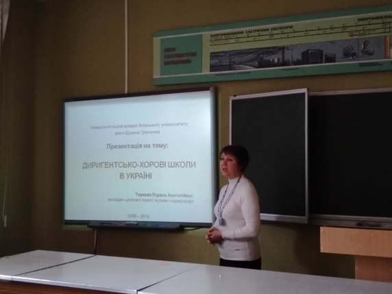 19.04.2019 р. о 13.10 в Університетському коледжі відбувся науковий семінар "Хорові школи в Українському хоровому виконавстві", де майбутні учителі музичного мистецтва ознайомилися з культурними та історичними аспектами розвитку хорового мистецтва в Україні; здійснили аналіз методичних концепцій кафедр хорового диригування закладів мистецької освіти Львова, Києва, Одеси, Харкова; дослідили методологічну базу комплексного підходу до хорового мистецтва, напрямки розвитку диригентсько-хорової педагогіки, а також творчу діяльність сучасних хорових колективів України, а саме: камерного хору «Кредо» (м.Київ), хорової капели «Орея» (м. Житомир), Державної заслуженої капели України «Трембіта» (м. Львів), камерного хору «Чернівці» (м.Чернівці), вокального ансамблю «Консонанс» (м. Харків), Національного хору імені Г.Верьовки (м. Київ), дитячого хору «Щедрик» (м.Київ) тощо.