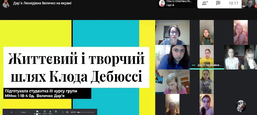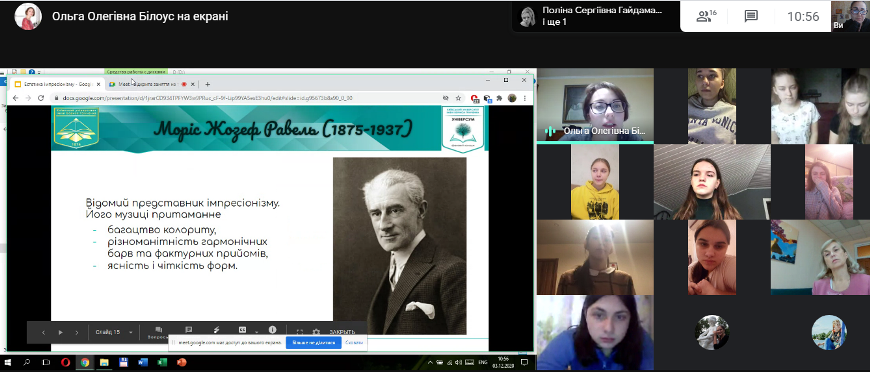 3 грудня 2020 року відбулося відкрите заняття викладача Білоус О.О. з навчальної дисципліни «Світова музична література» на тему «Естетика імпресіонізму в творчості Клода Дебюссі та Моріса Равеля» (група ММмс-1-18-4.0д.).