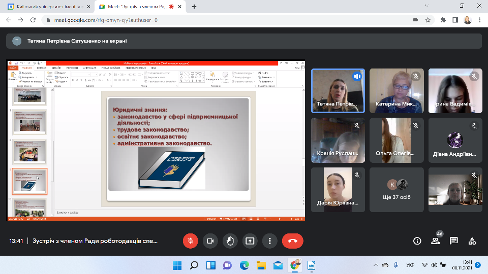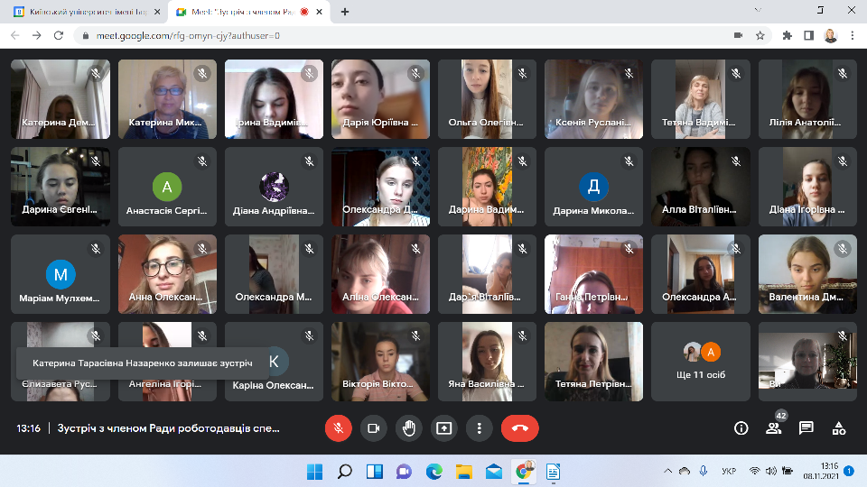 08.11.2021 р. відбулася зустріч студентів ІІ-ІV курсів спеціальності "Хореографія" з членом Ради роботодавців, тренером-викладачем спортивного бального танцю Національного університету фізичного виховання та спорту України, керівником ТОВ Клуб спортивного бального танцю "ТенДенс" Євтушенко Т. П. на тему "Дослідження багатовекторності підготовки майбутніх хореографів та переліку вмінь, необхідних для роботи з хореографічними колективами".