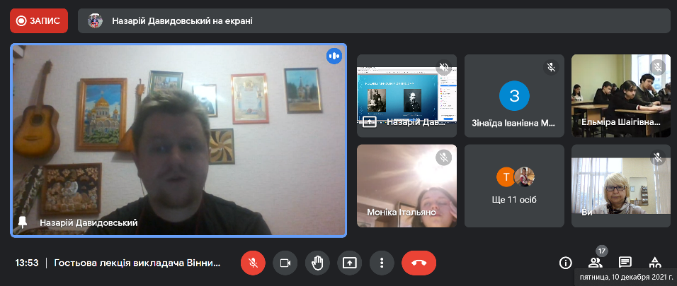 10.12.2021 р. відбулася гостьова лекція викладача Вінницького гуманітарно-педагогічного коледжу, художнього керівника Народної жіночої хорової капели "Соломія" Назарія Давидовського на тему "Борис Грінченко та Микола Леонтович: два могутні колоси української художньої культури".