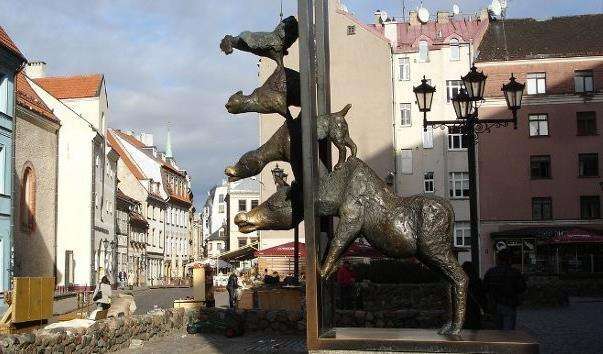 Ще один пам’ятник знаходиться в місті-побратимі Бремена – Ризі. Це - скульптурна композиція, що зображує всесвітньо відомих осла, пса, кота і півня. Створив це творіння скульптор на ім'я Кріст Баумгартль в 1990 році. Компанія розташувалася біля собору Святого Петра і щодня піддається пестощам туристів.