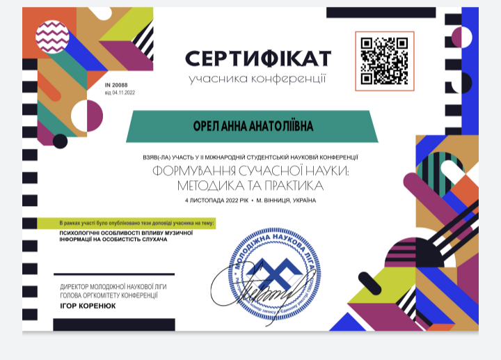 04.11.2022 року студенти спеціальності "Музичне мистецтво" Супряга Ольга, Витівська Вікторія та Орел Анна взяли у часть у II Міжнародній студентській науковій конференції "Формування сучасної науки: методика та практика".