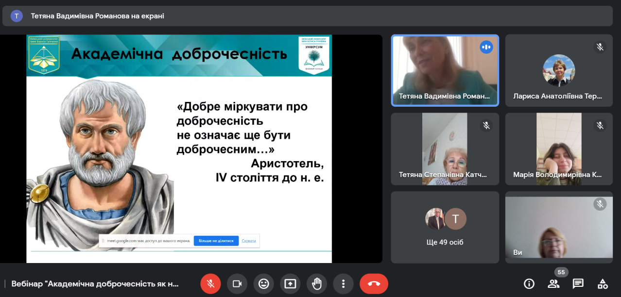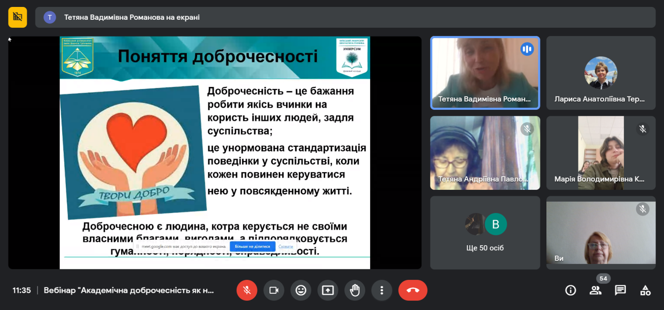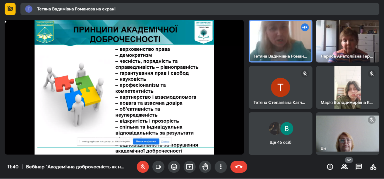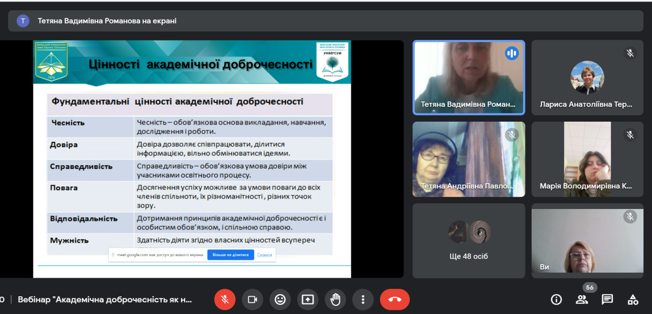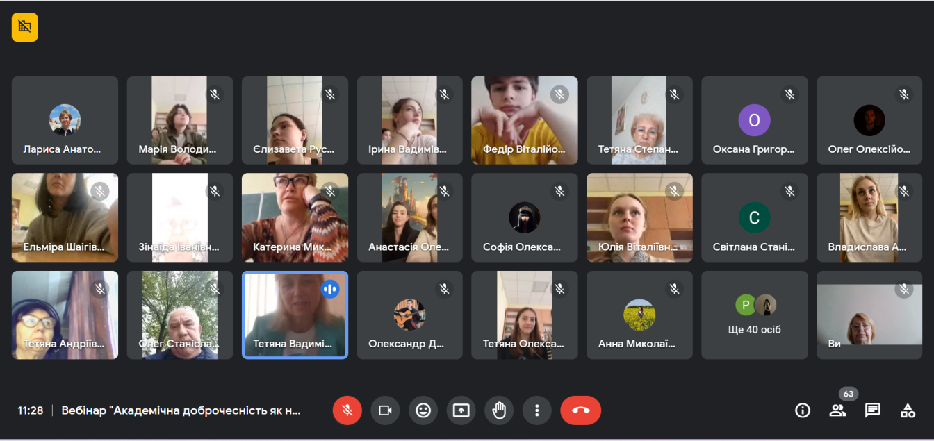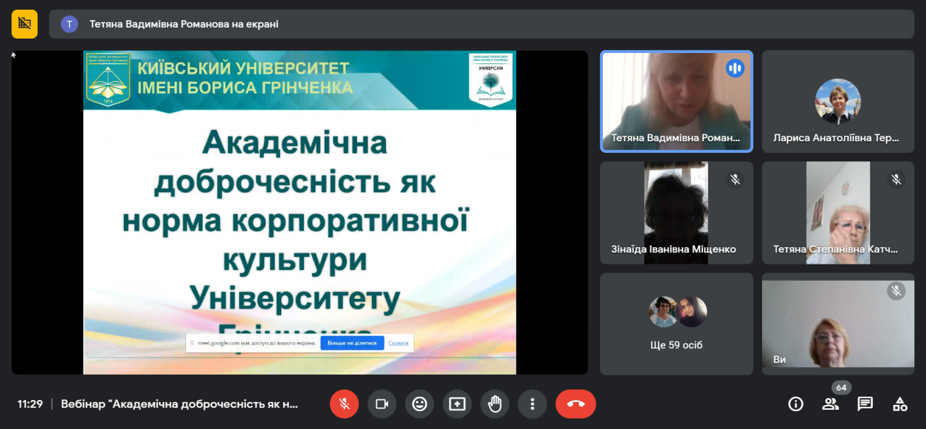 17.05.2023 року в рамках Фестивалю науки для викладачів циклової комісії музики і хореографії та студентів спеціальності "Музичне мистецтво" і "Хореографія" було проведено вебінар "Академічна доброчесність як норма корпоративної культури Університету Грінченка". Мета заходу полягала в розкритті змісту та ролі академічної доброчесності як важливого компонента корпоративної культури Університету, визначенні важливості дотримання фундаментальних принципів академічної доброчесності в освітньому процесі.