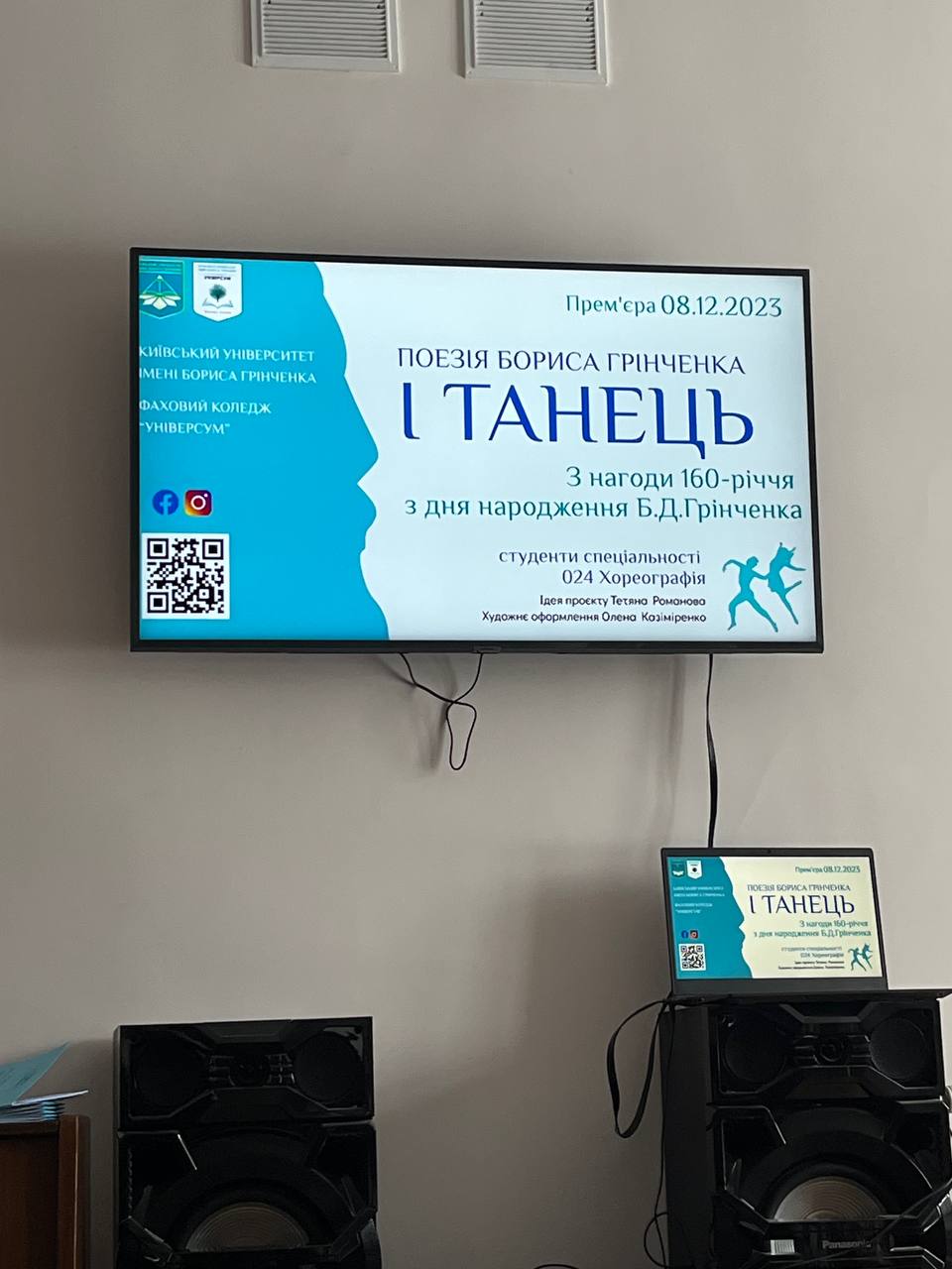 08.12.2023 року у Фаховому коледжі «Універсум» для студентів спеціальностей «Хореографія» та «Музичне мистецтво» відбувся прем'єрний показ творчого проєкту студентів-хореографів на тему «Поезія Бориса Грінченка і танець» (в межах проєкту «Україна. У цьому слові для мене все: талановиті й незламні»).
