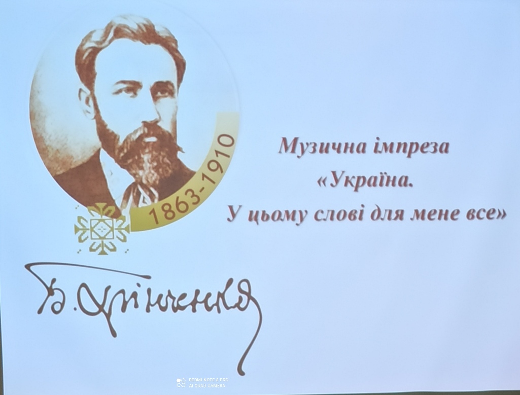 09.12.2024 року в актовій залі Фахового коледжу «Універсум» Київського столичного університету імені Бориса Грінченка відбулася музична імпреза «Україна. У цьому слові для мене все», присвячена 161-й річниці з дня народження українського письменника, фольклориста, етнографа, лексикографа, мовознавця, педагога, борця за українську незалежність Бориса Грінченка.