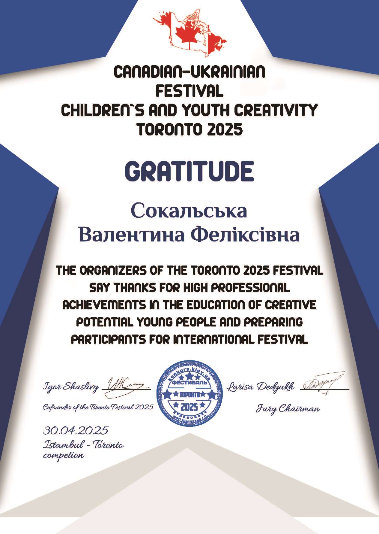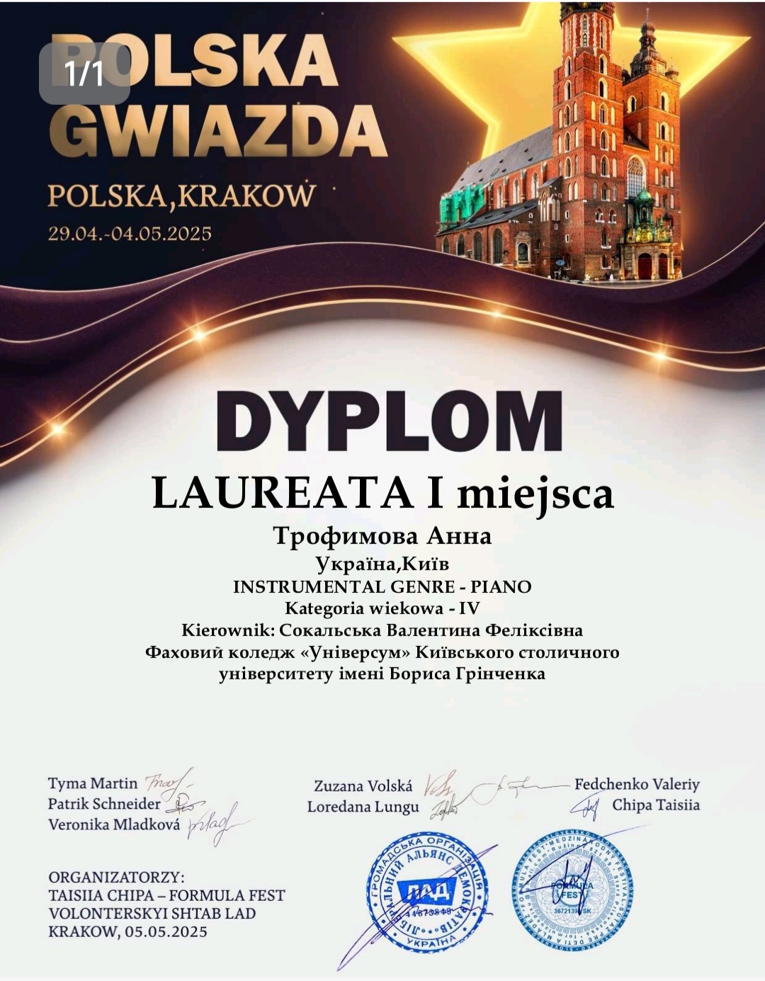 В квітні 2025 року студентка 1 курсу спеціальності «Музичне мистецтво» ТРОФИМОВА АННА взяла участь у міжнародному мистецькому конкурсі «POLSKA GWIAZDA» (Краків, Польща) та Канадсько-Українському фестивалі-конкурсі «ISTANBUL-TORONTO COMPLETION». В обох конкурсах студентка здобула перемогу і отримала дипломи І ступеня.
