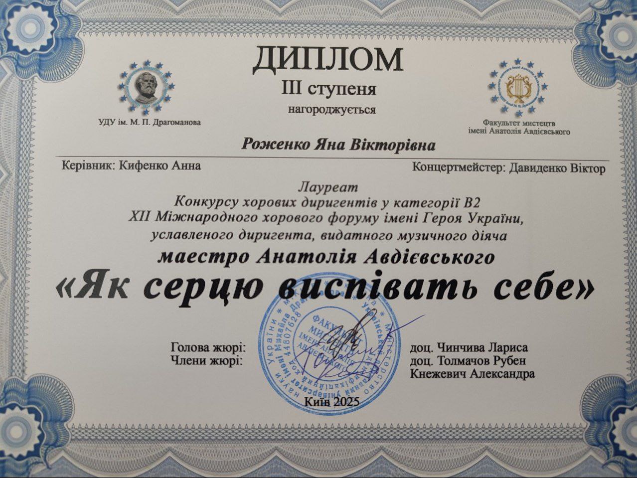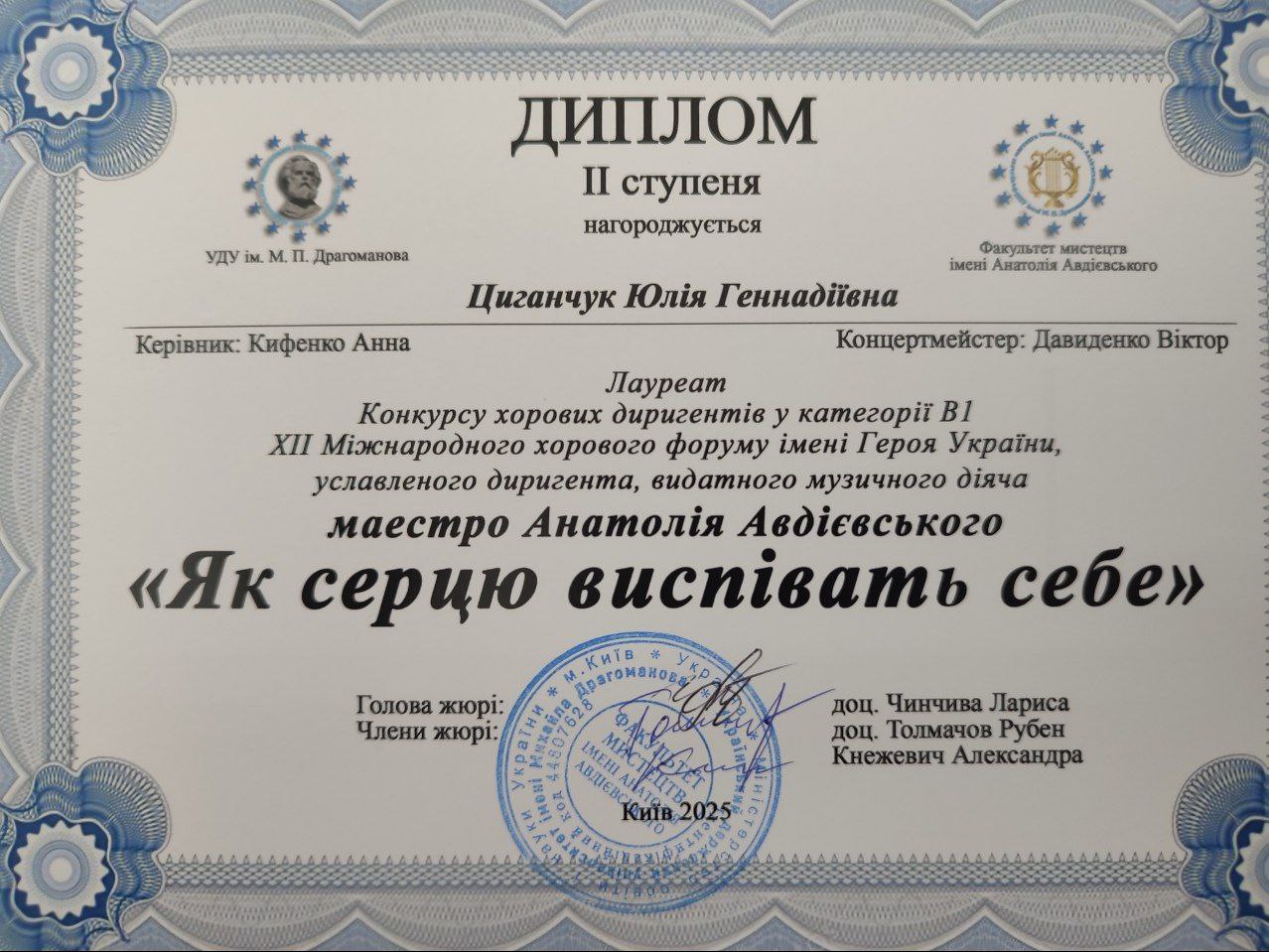 19 травня 2025 року на базі Українського державного університету імені Михайла Драгоманова пройшов ХІI Міжнародний хоровий форум імені Героя України, уславленого диригента, видатного музичного діяча маестро Анатолія Авдієвського «Як серцю виспівать себе».