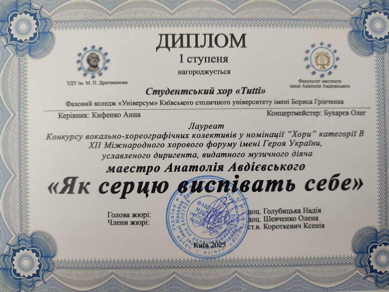 У конкурсі вокально-хореографічних колективів у номінації «Хори» студентський хор «Tutti» Фахового коледжу «Універсум» Київського столичного університету імені Бориса Грінченка отримав диплом лауреата I ступеня (керівник — Анна Кифенко, концертмейстер — Олег Бухарєв).