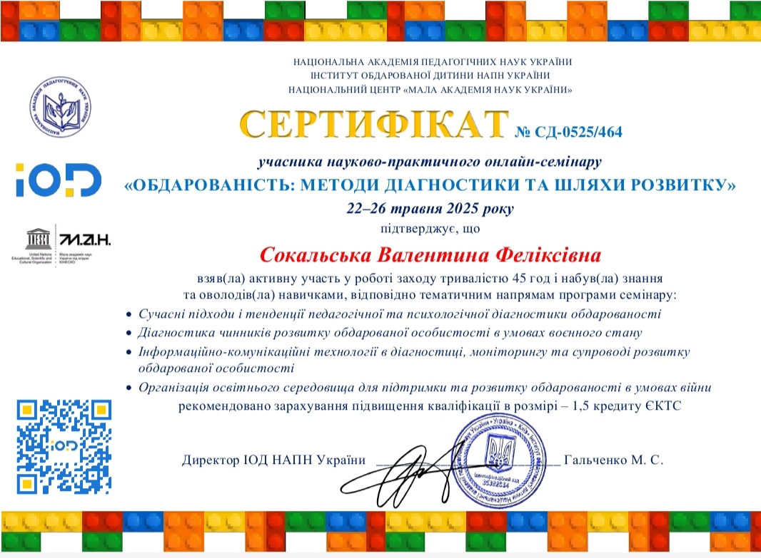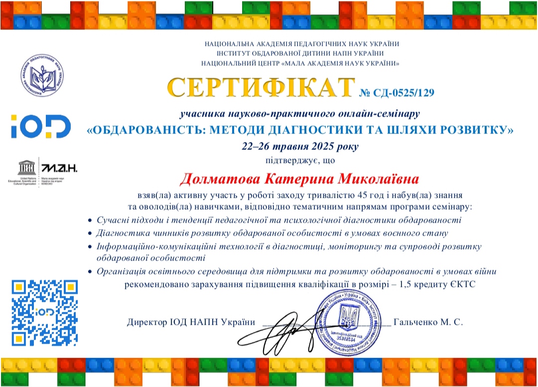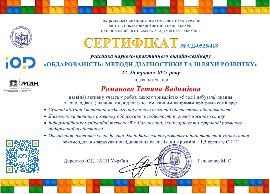 22–26 травня 2025 року за сприяння Національної академії педагогічних наук України, Інституту обдарованої дитини НАПН України, Національного центру «Мала академія наук України» відбувся науково-практичний онлайн-семінар «Обдарованість: методи діагностики та шляхи розвитку».