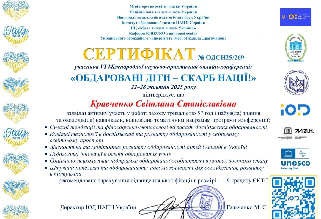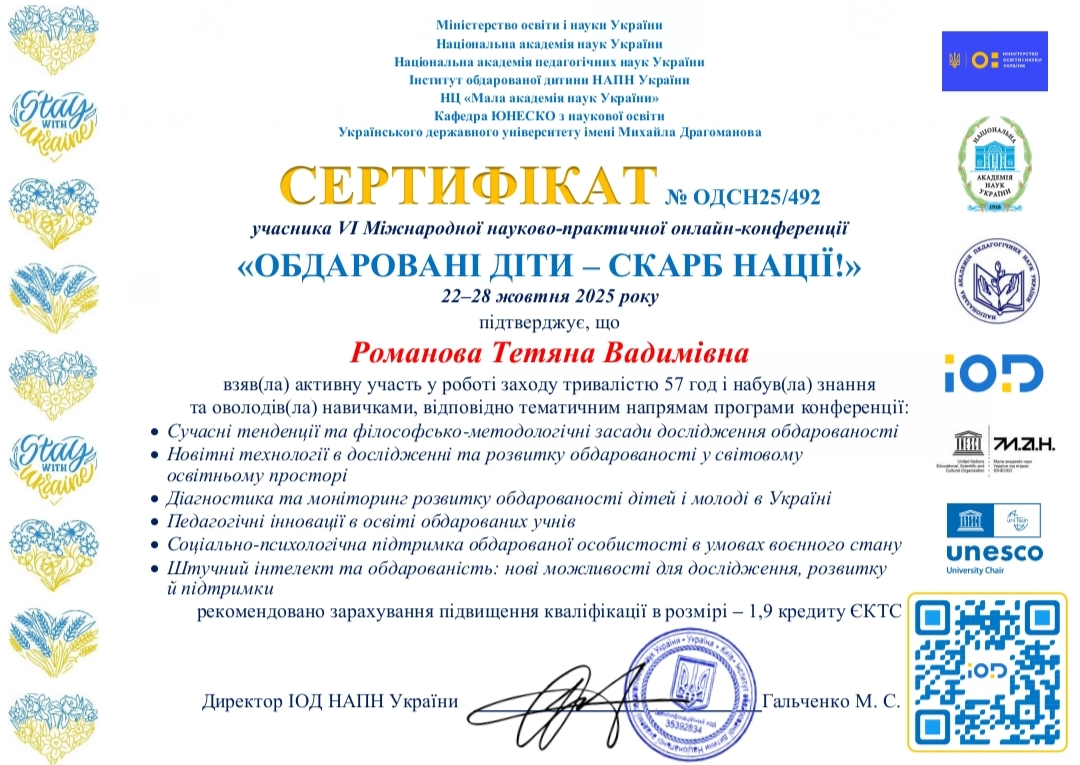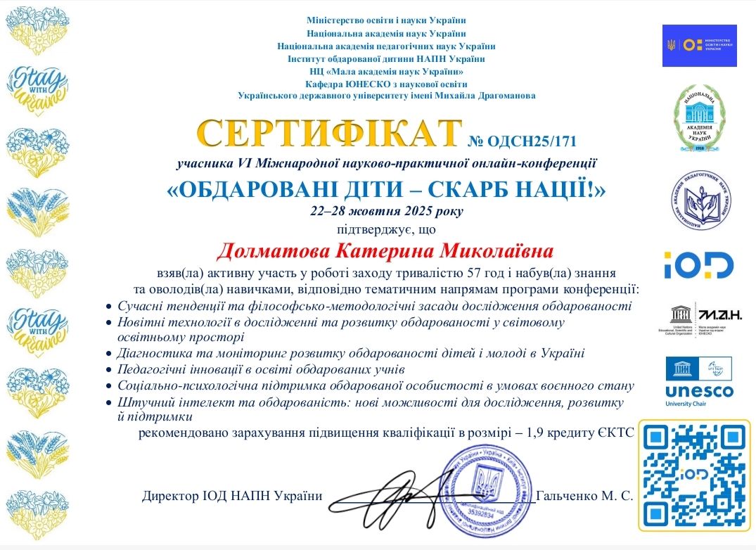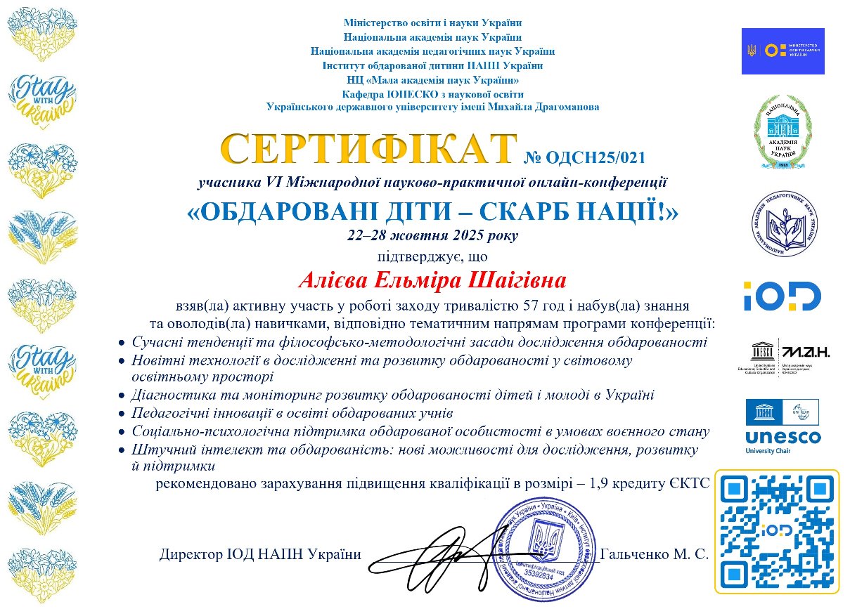22–28 жовтня 2025 року за сприяння Міністерства освіти і науки України, Національної академії наук України, Національної академії педагогічних наук України, Інституту обдарованої дитини НАПН України, Національного центру «Мала академія наук України» відбулася VІ Міжнародна науково-практична онлайн-конференція «Обдаровані діти - скарб нації».