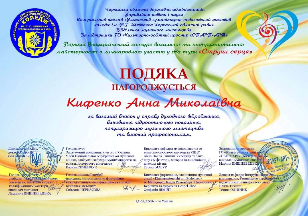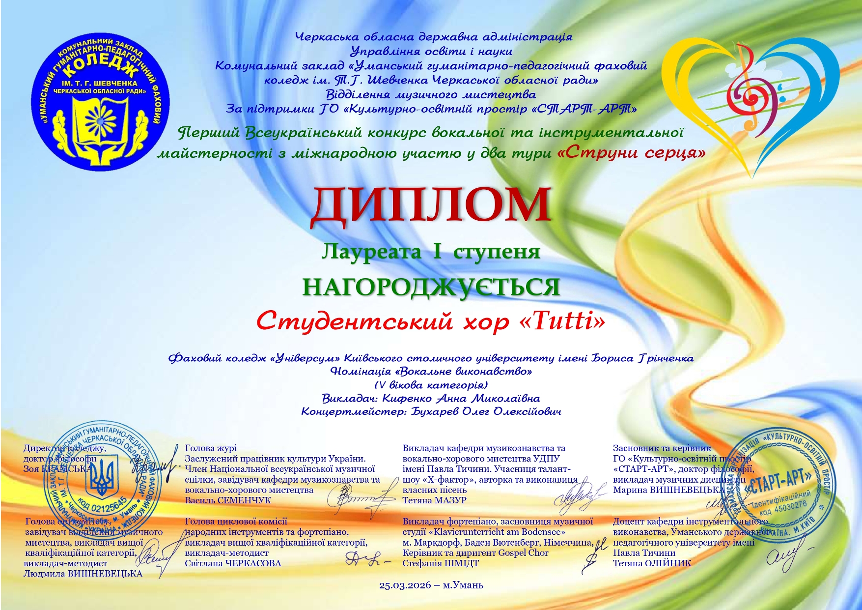 25.03.2026 року студентський хор "Tutti" взяв участь у І Всеукраїнському конкурсі вокальної та інструментальної майстерності «Струни серця» з міжнародною участю та здобув диплом I ступеня!
