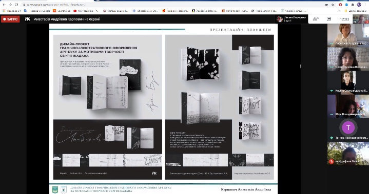 • Карпович Анастасії Андріївни («Дизайн-проєкт графічно-ілюстративного оформлення арт-буку») - за високий рівень виконавської та творчої майстерності.