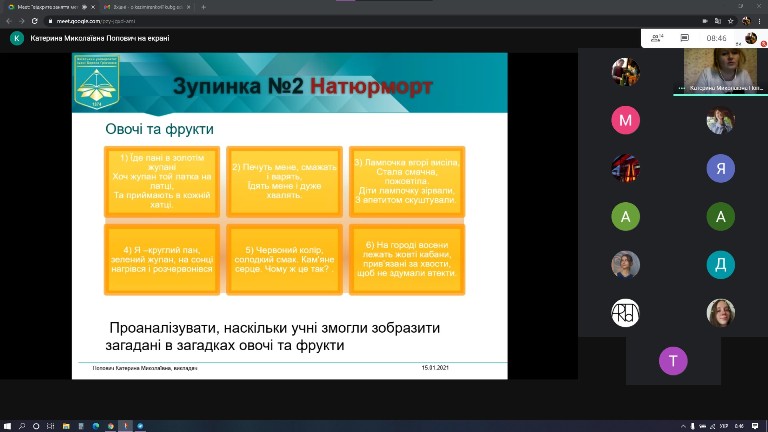 15 cічня 2021 року в Фаховому коледжі Київського університету імені Бориса Грінченка відбулось відкрите заняття викладача Попович К.М. з дисципліни «Методика навчання образотворчому мистецтву» на тему: «Сучасні нестандартні уроки образотворчого мистецтва в основній школі» (група ОМмс-1-17-4.Од).