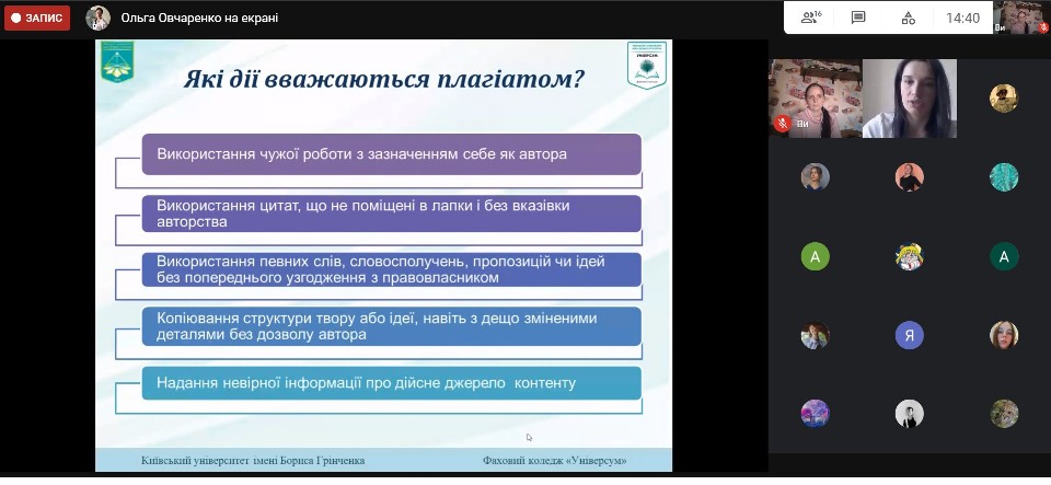 29 квітня 2021 року голова циклової комісії образотворчого мистецтва і дизайну Овчаренко Ольга Миколаївна запросила всіх охочих приєднатись до онлайн-вебінару «Плагіат в образотворчому мистецтві, його прояви та шляхи подолання».